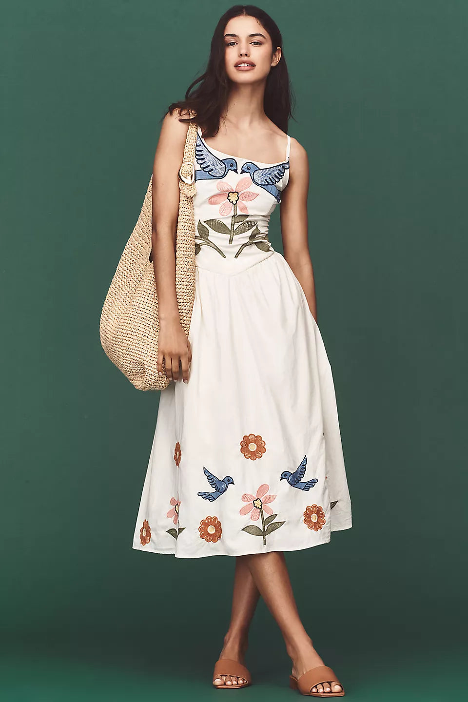 De Calista Dress is jouw ultieme zomerdroom. Met haar frisse wit/beige tint, rechte halslijn en handgeschilderde look is deze jurk een ode aan zonnige dagen en spontane momenten. De afdruk? Twee vogel blauwetjes boven een bloeiende bloem – zacht, uniek en net nog anders.
